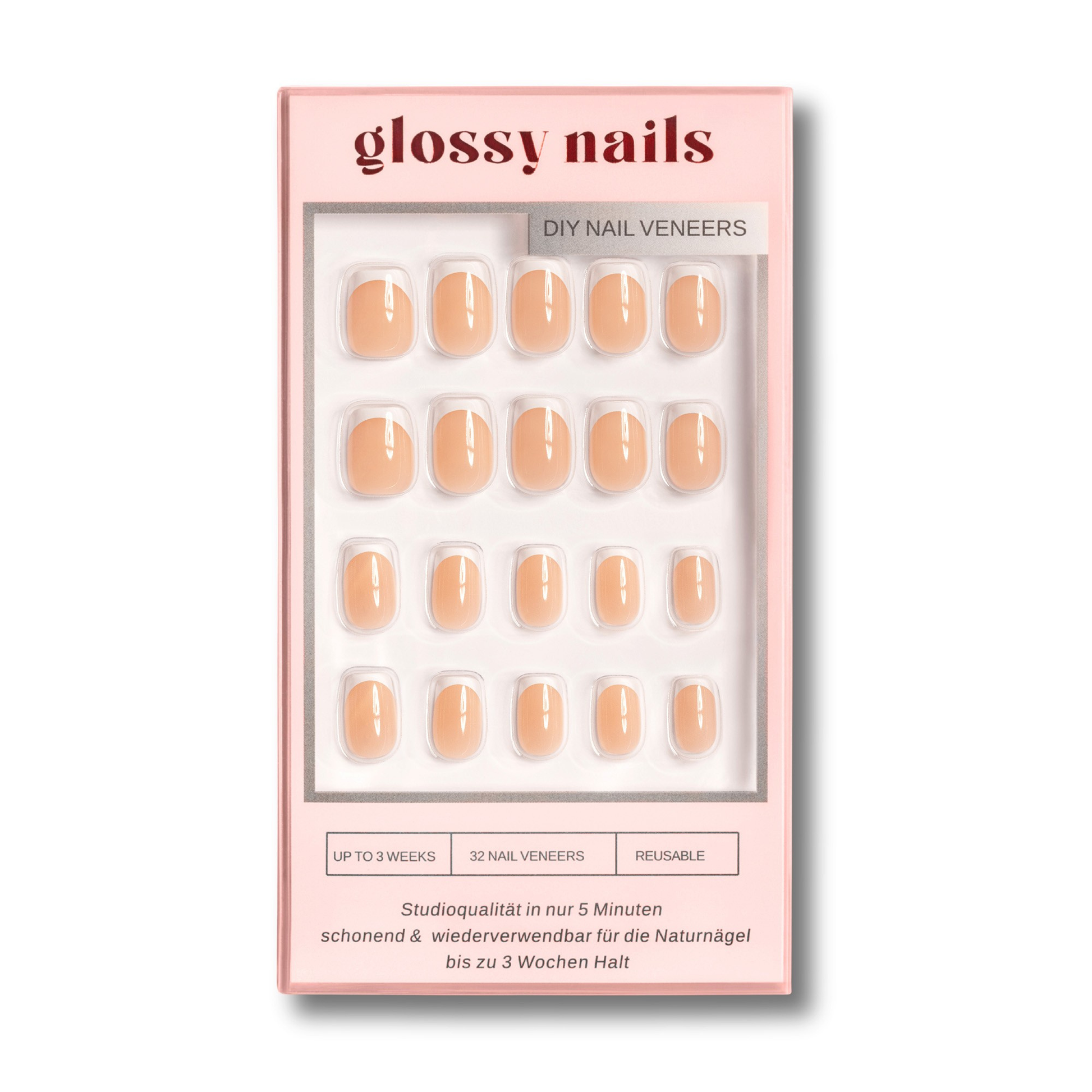 Glossy Nails Nail Veneers sind der schnellste Weg zu makellosen Nägeln. In wenigen Minuten hast du einen professionellen Look ganz ohne Studio, ohne UV-Lampe und ohne lange Wartezeit. Wähle aus mehr als 30 exklusiven Designs und erlebe, wie einfach perfekte Nägel sein können sogar, wenn es mal schnell gehen muss.